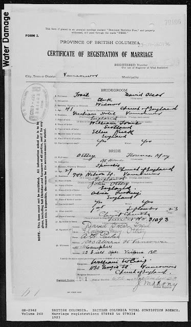 David Oscar Trail and his wife Florence May Ottley were both born in England. As is evidenced by their wedding certificate, David had been previously married. David and Florence were married at Christ Church in Vancouver.